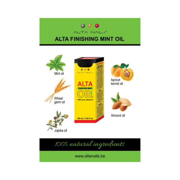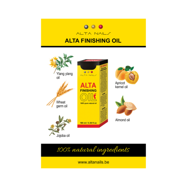 ALTA finishing oil (100% pure natural oil) kan zowel bij professionele behandelingen als thuis worden gebruikt. De olie is ideaal voor het herstellen en hydrateren van hand- en voethuid, heeft voedende, antioxiderende, verzachtende, regenererende, ontstekingsremmende werking en is bijzonder geschikt voor de verzorging van de droge en zeer droge huid. De olie herstelt de hydrolipidenfilm, maakt de huid glad, elimineert schilfers verhoogt de elasticiteit.
