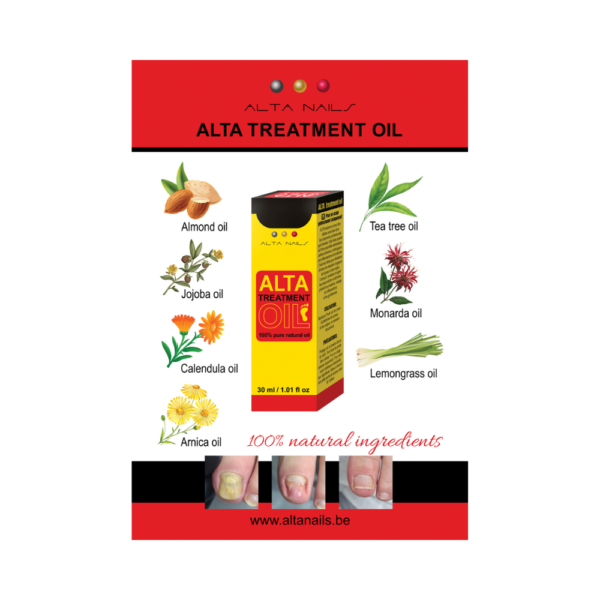 ALTA treatment oil kan zowel bij professionele behandelingen als thuis worden gebruikt. Deze olie heeft sterke antiseptische, antimicrobiële, schimmelwerende, ontstekingsremmende en verzachtende eigenschappen. De olie is ideaal voor het ontsmetten, elimineren van schimmelachtige huid- en nagelziekten. Ze verzacht, revitaliseert en geneest de droge en beschadigde huid, voorkomt littekens, verlicht ontstekingen en zwellingen.